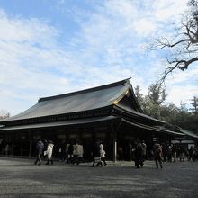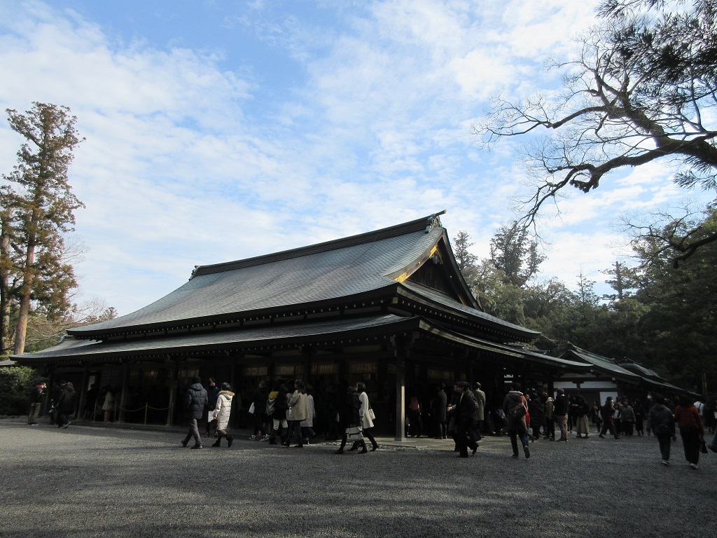 伊勢神宮内宮の正宮に向かう途中右手に見えてくる大きな建物が神楽殿です。祈祷の御神楽を行う場所ですが、お神札・おみくじ授与やご祈祷の受付などもこちらになります。伊勢神宮は参拝無料ですが、祈祷は何千円から数万円ほどかかります。大勢の参拝客がお札を買い求めていました。