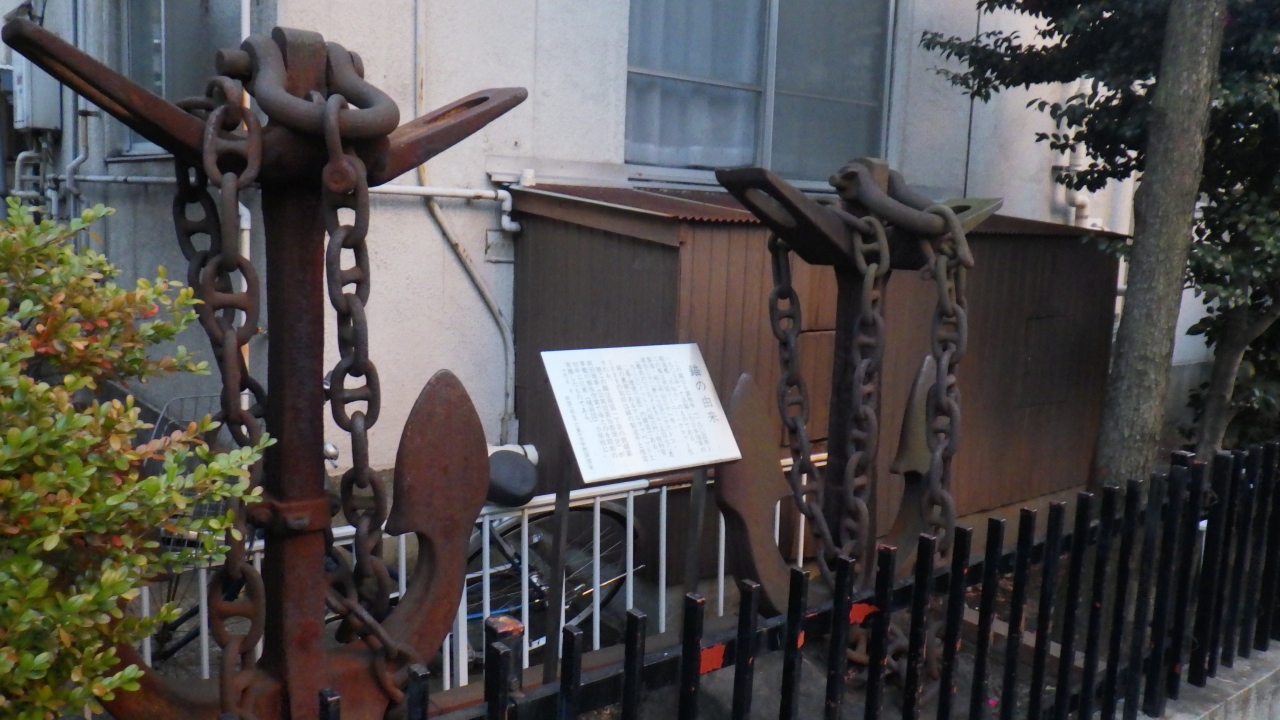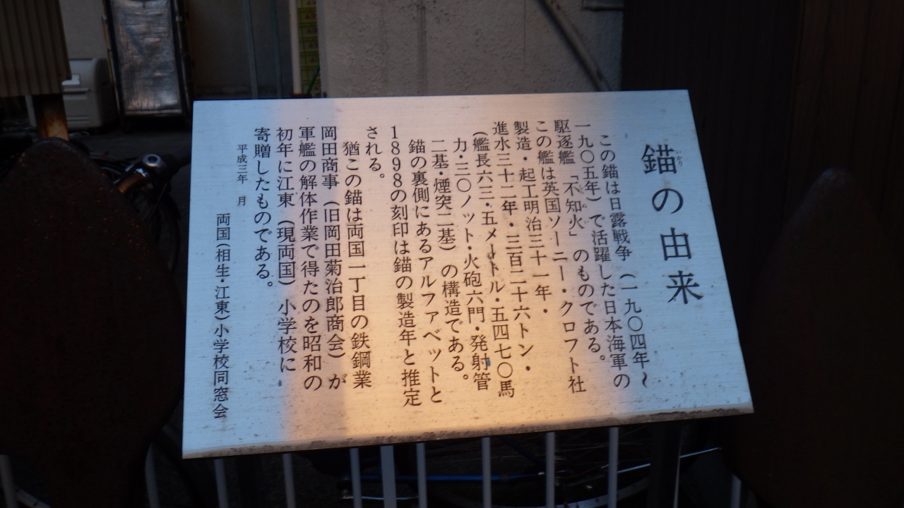 JR両国駅西口から南東方向へ400mほど、京葉道路を渡って進むと墨田区立両国小学校の敷地内北西側端、芥川龍之介の文学碑の隣の柵向こう側にあり道路側から見ることのできる位置にあります。案内板によると、日露戦争で活躍した日本海軍駆逐艦不知火の錨で、両国の鉄鋼店が軍艦解体の時に得たものを寄贈したものだそうで、明治時代の鉄鋼技術を知るうえで大変貴重な錨だそうです。