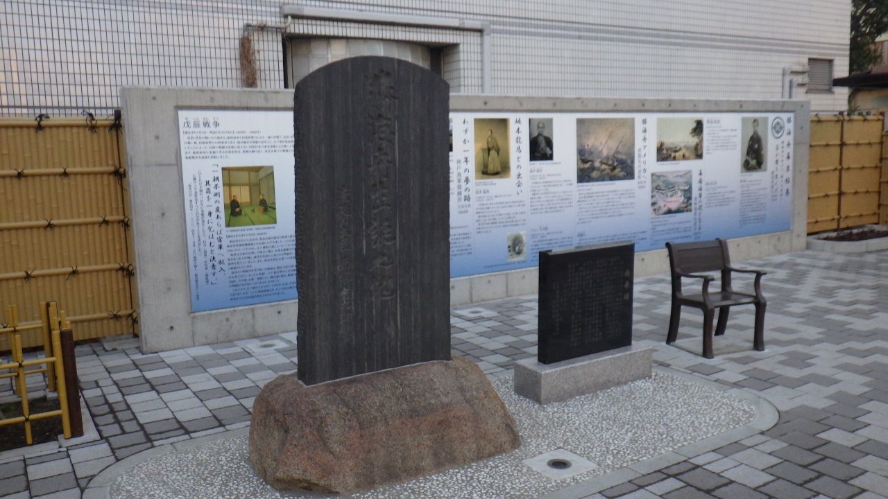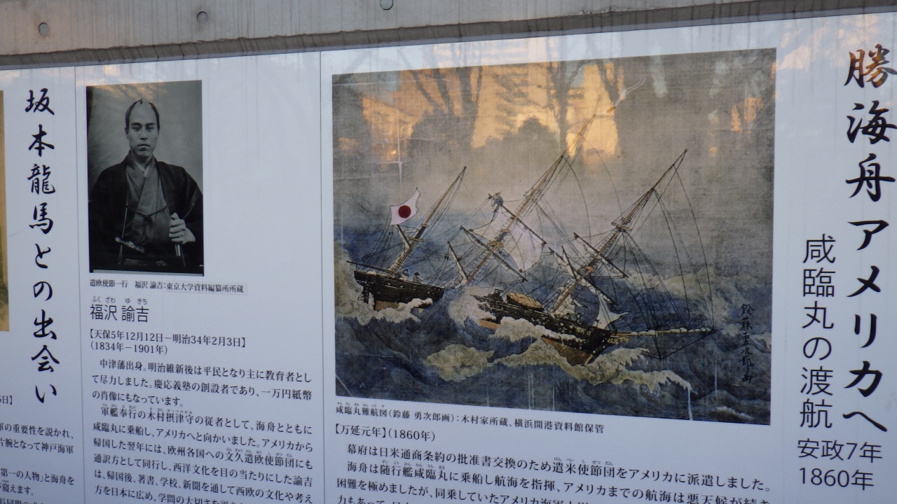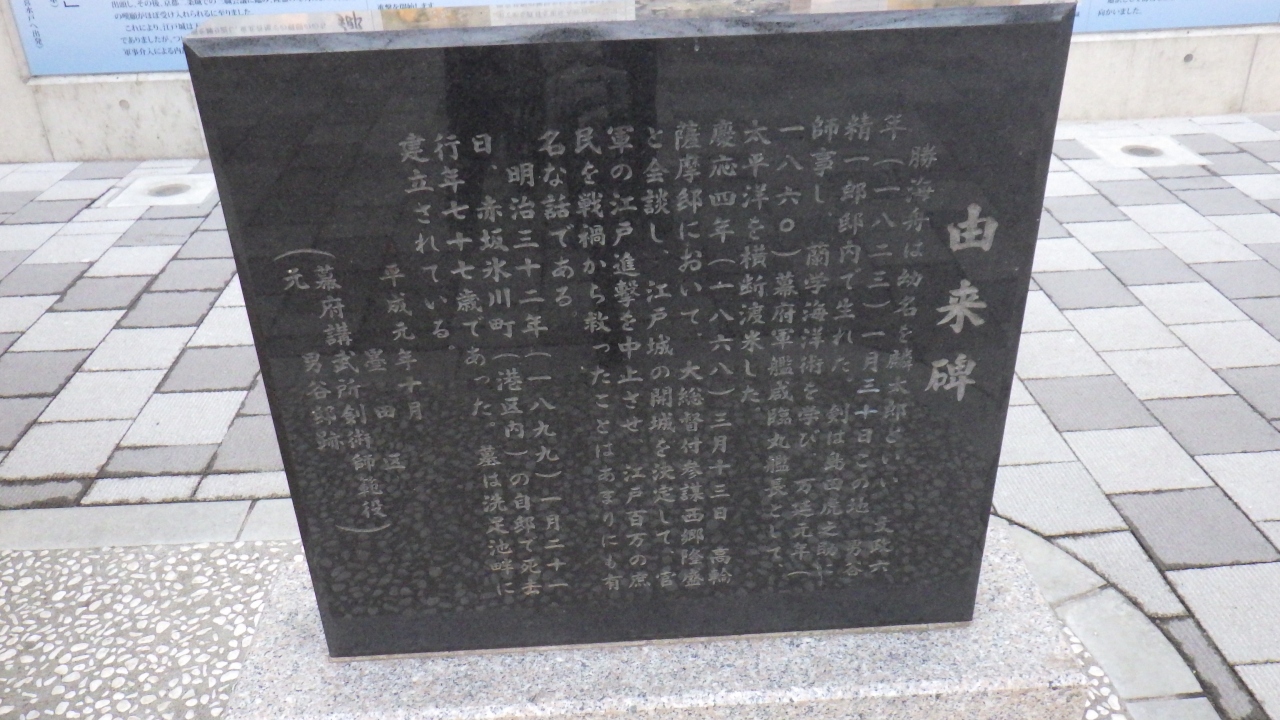 全く一般的な公園ですが、公園敷地南西側にかなりの展示スペースを確保して墨田区が石碑や案内板、展示プレートが設置されていて、由来碑なる黒御影石で作られた石碑によると1823年この地で生まれたこと、蘭学海洋術を学び臨海丸の艦長、江戸城無血開城など港区の自邸で77歳で亡くなったことが刻まれています。