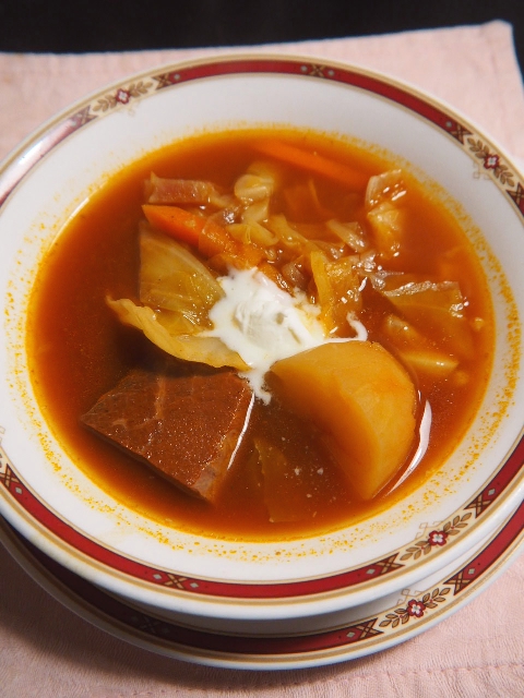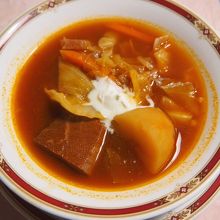 ボルシ(ボルシチを当店では「ボルシと称するらしい」)は、トマトベースのスープ。スープとはいうものの、具沢山で、日本人の感覚からするとシチューに近い。大振りにカットされたビーフや、ジャガイモが使われていて、食べ応えが。ロシアのスープらしく、サワークリームがトッピングしてあった。