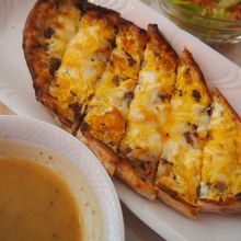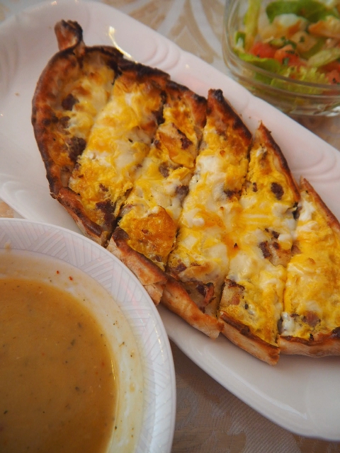 ピデザヤ(Pidezzaya)は、リーフの形をした大き目のパン。チーズと玉子が乗っていた。このピデは、イタリアのピザや、ギリシャのピタパンの原点だとか。事実かどうかは分からないが、現在の観点からすると、ピザのバリエーションの様。玉子を使ったのはそうそう無いが。生地はナポリピザより若干厚みがあるが、アメリカンタイプのピザ程ふかふかではない。まさにピザ生地とパン生地を足して2で割ったかの様。チーズも玉子も、とろけていた。ピザとは異なり、トマトは使っていない。ボリュームがあり、食べ応えが。