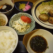 メインの肉団子の他、パスタサラダ、小鉢2種(肉じゃがとひじき)、漬物、味噌汁から成る。お盆一杯に小皿が並ぶので、物凄いご馳走に見えてしまう。