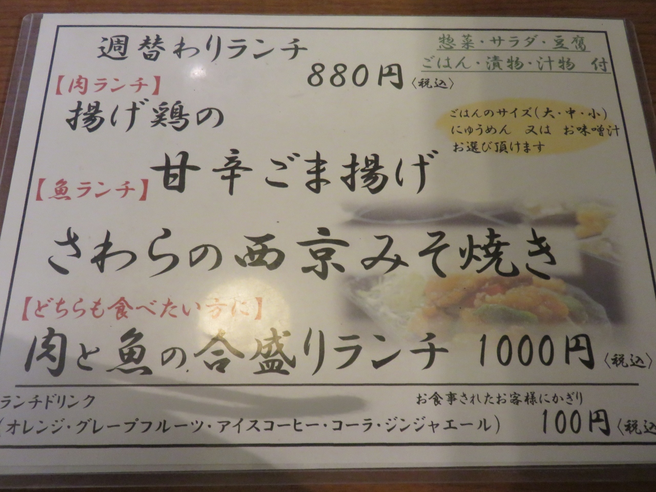 揚げ鶏の甘辛ごま揚げとさわらの西京みそ焼きがメインになっていて、ごはんのサイズ(大・中・小)からセレクト