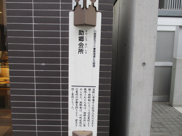 京急川崎駅から駅前交差点を左折し砂子交差点を左折し旧東海道を多摩川方面に進み川崎宿交流館先の東照のそばにある助郷会所跡標識に歩いて5分ぐらいで着きます。助郷会所は江戸時代に宿場の伝馬人足が不足した際に幕府や藩により人馬の補充を目的として宿場周辺の村落に課した夫役のことで、農村の窮乏を招く要因となり民・百姓を大いに苦しめその割付けをめぐる争論とか多かったのだ想像されますので散策にお立ち寄りをお勧めします。標識にこの制度が記されています。少し標柱が地味なのが残念です。