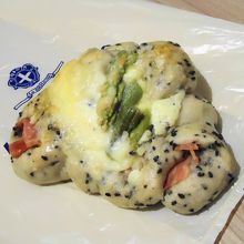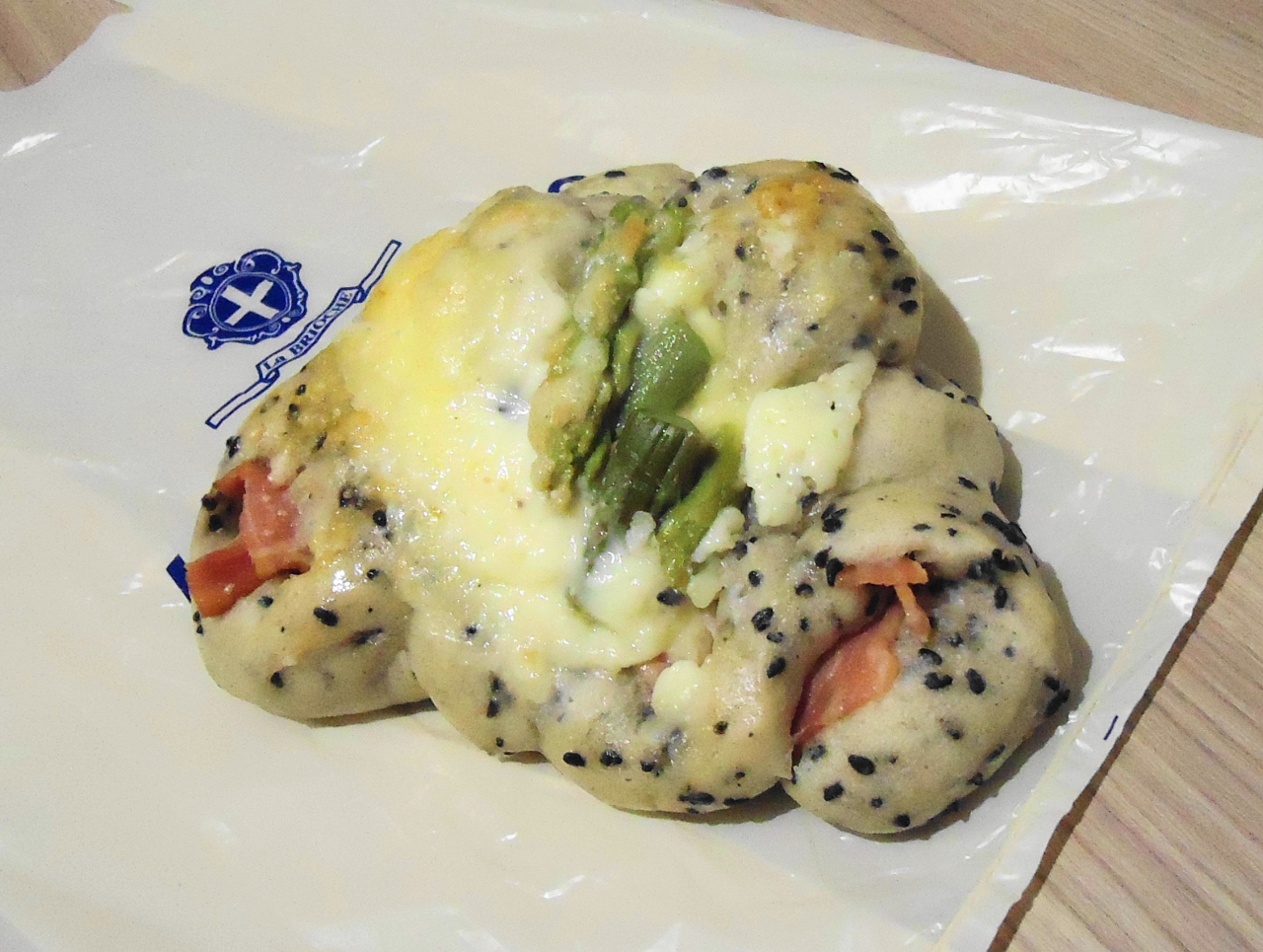 惣菜パンは、ベーコン・アスパラ・チーズがトッピング、生地の胡麻が効いていて美味しいです。