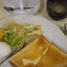 メインのプレートにはバターを塗った厚切りトースト、サラダ、ポテトサラダ、ゆで卵、そしてバナナが盛られている。