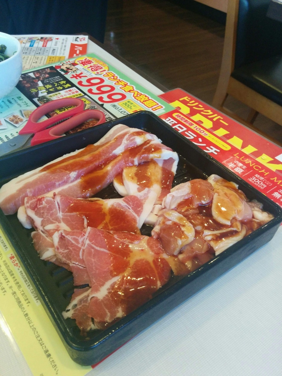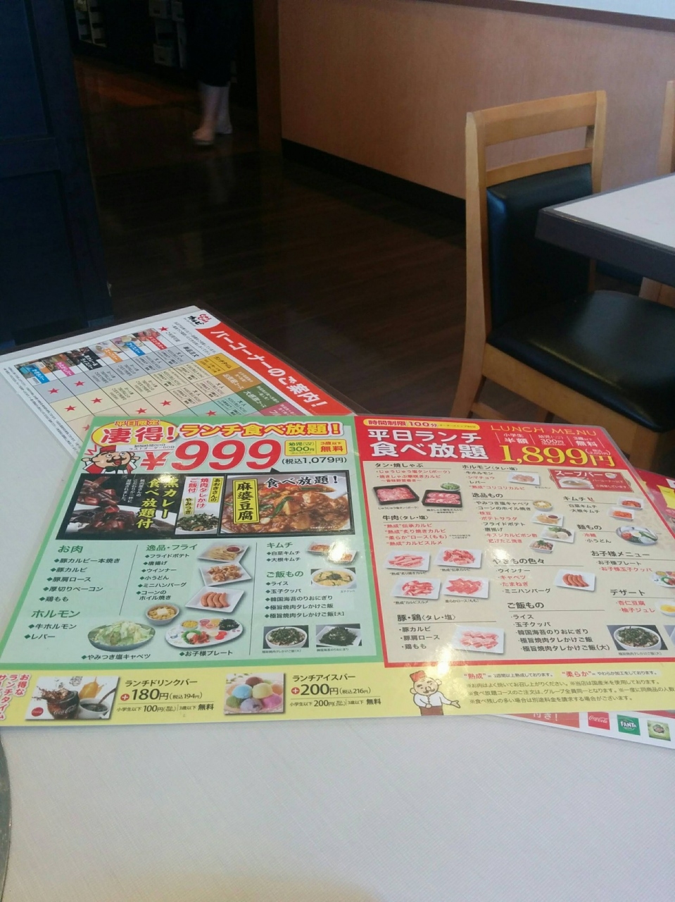 平日なんと999円(税抜)で焼肉の食べ放題が頂けます。メニューは、お値段がお値段なので豚が中心で豚カルビ一本焼、豚カルビ、豚肩ロース、厚切りベーコン、 鳥もも、牛ホルモン、レバー、サイドメニューは、フライドポテト、唐揚げ、ウインナー、小うどん、ミニハンバーグ、コーンのホイル焼き、やみつき塩キャベツ、お子様プレート、白菜キムチ、大根キムチ、麻婆豆腐です。ご飯ものがライス、玉子クッパ、韓国海苔おにぎり、極旨焼肉のたれごはん、極旨焼肉のたれごはん(大)、黒カレーです。