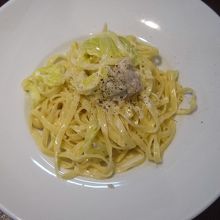 パスタは本日のパスタ2種類と、本日の生パスタ1種類から選べる。今回、本日の生パスタ(若鶏と春キャベツのクリームソース)を選んだ。