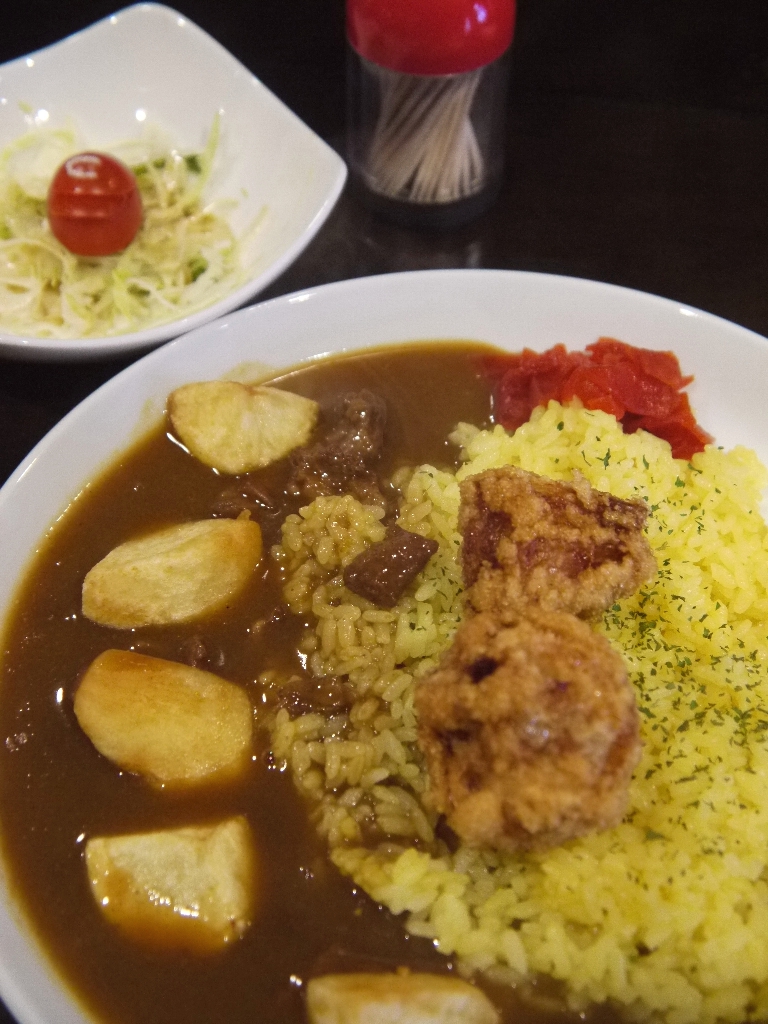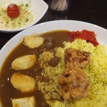 カレーは、サフランライスにカレールーを回し掛け、揚げポテトをトッピングし、更に唐揚げを乗せていた。