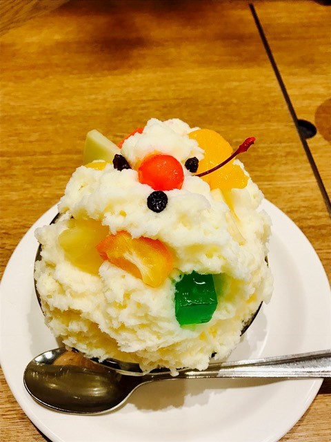 鹿児島中央駅に併設されているアミュプラザの地下1階にあるお店です。お好み焼きなどもありますが、やはり観光客の目当ては「白熊」だと思います。いろいろ種類がありますが、私は定番の白熊をいただきました。MサイズとSサイズがあり、私はSサイズを選びましたが、意外と大きかったです。