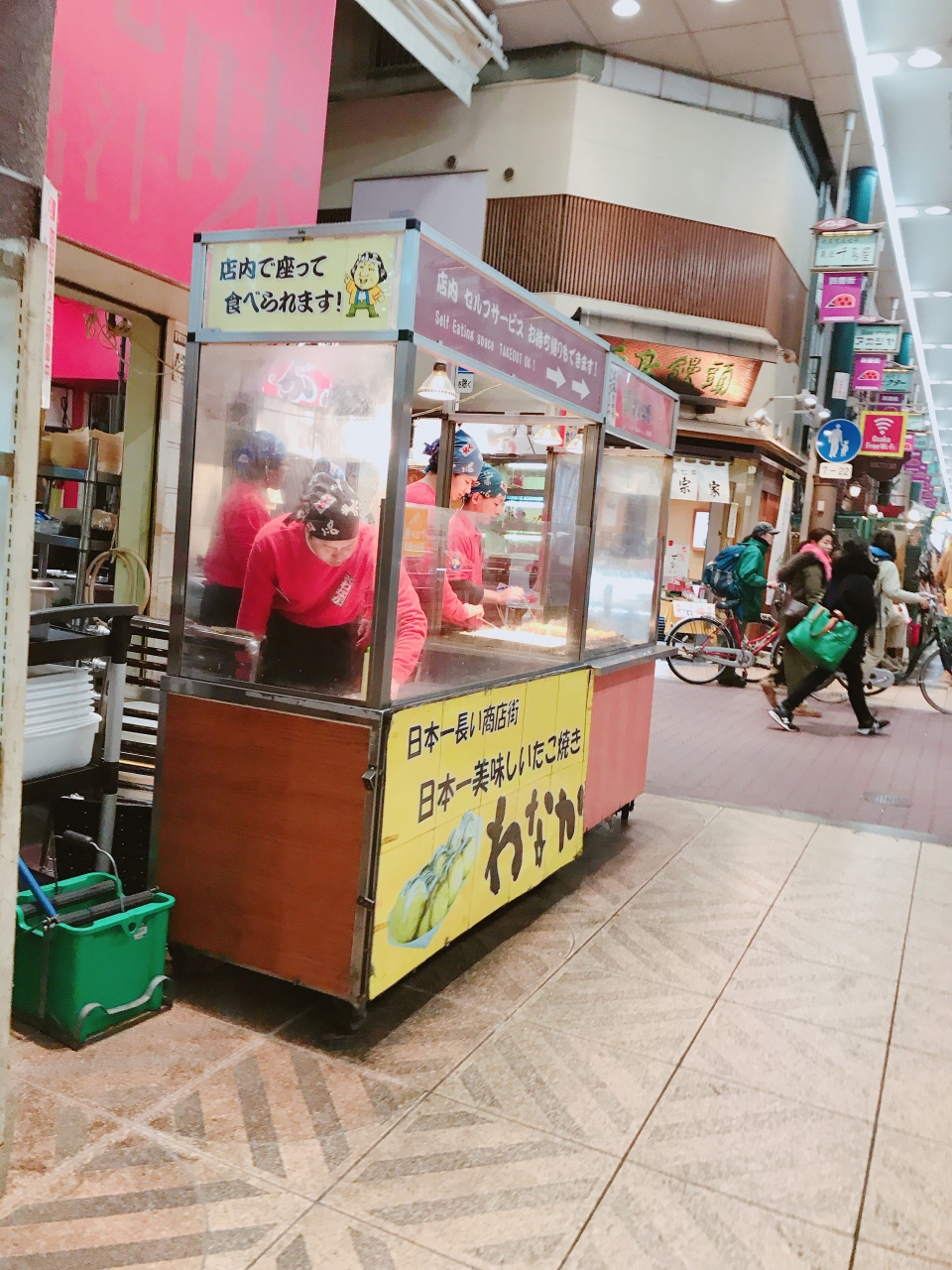 わなかのたこ焼きが大好きです。なんばにありますが、なんと天神橋筋商店街の4丁目にもあります。しかもすいているのでスムーズに購入できるのもうれしいですね。あつあつのたこ焼きをおいしくいただきました。おいしいな