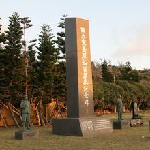 「南大東島開拓百周年記念碑」と書かれた立派な標柱を挟み、向かって右側には「開拓の祖」玉置翁の銅像、左側に鍬を担いだは開拓民像が立っています。