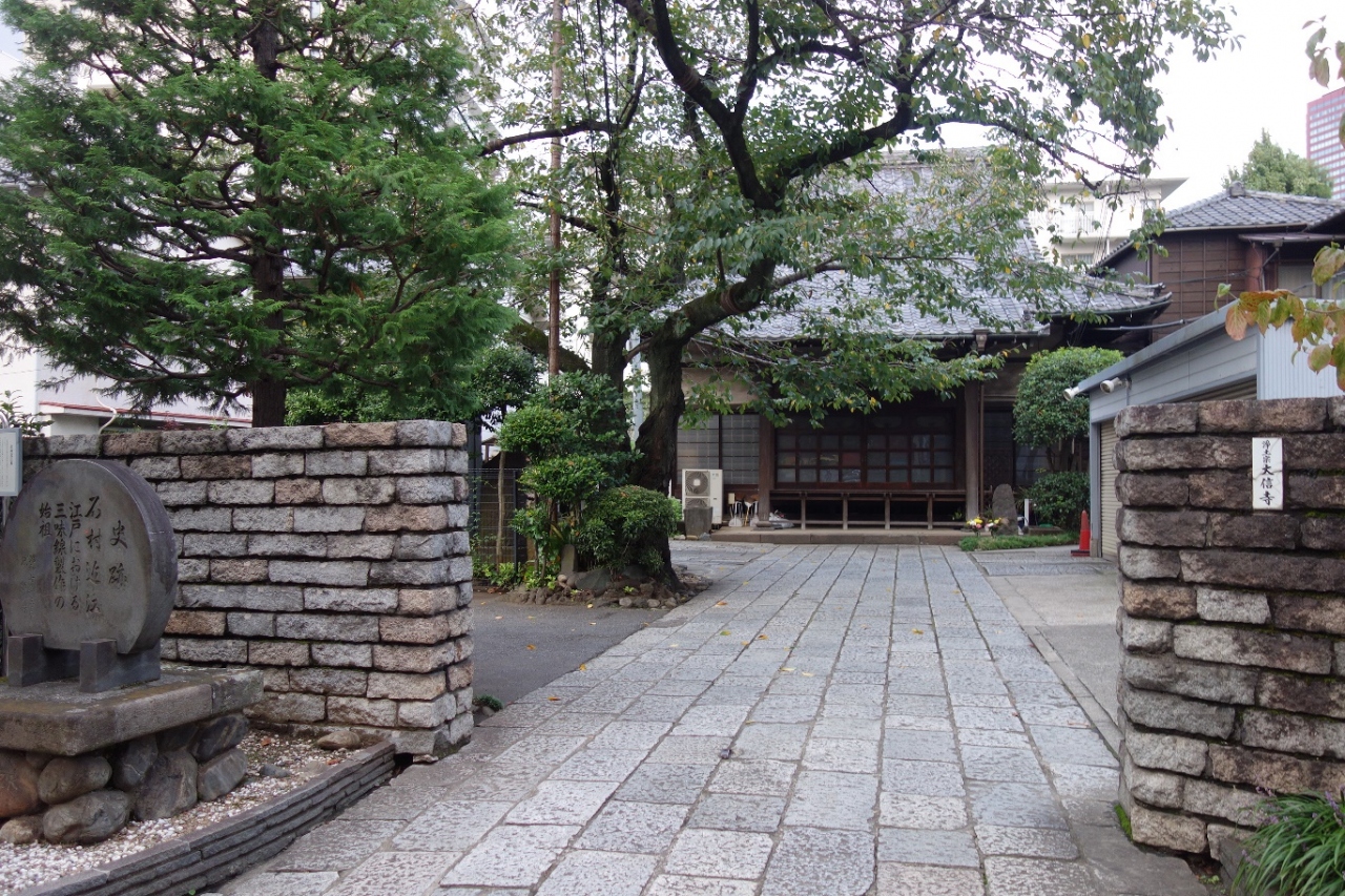 三田エリアを散策中こちらのお寺へ立ち寄りました。魚籃坂沿いにある寺院で付近には幾つものお寺が有って散策が楽しい地域です。中でも特に大信寺は三味線製作の始祖と呼ばれる石村近江の墓が有ることでも有名で、山門前には石碑も置かれていました。