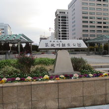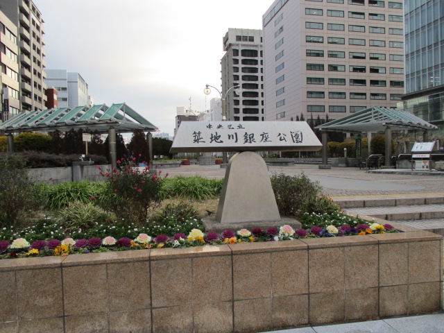 東銀座の駅から築地本願寺に歩いていく途中道沿いにあった大きな公園です。