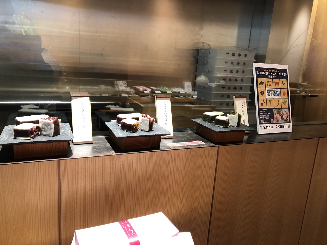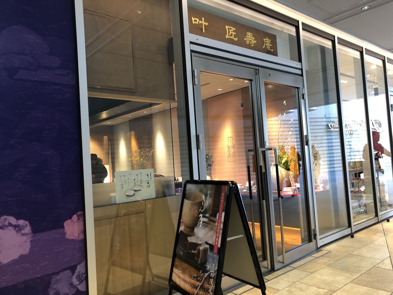 テラス1階のにある「叶 匠壽庵」さんお店に入るとすぐに、季節のお菓子試食と昆布茶を出して頂きました。