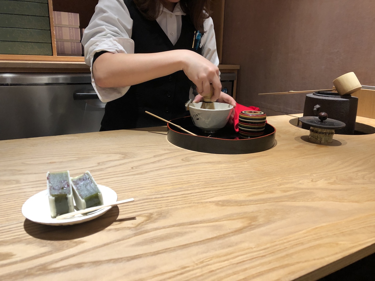 お店は広くありませんが、テーブルと椅子が2脚あり、そこで「きんつば」を食べる事が出来きて、抹茶のサービスもあります。なんとお店の人が目の前でお茶ををたててくれるんです。日本人の私でさえ嬉しかったので、外国の人とか喜ぶのでは…
