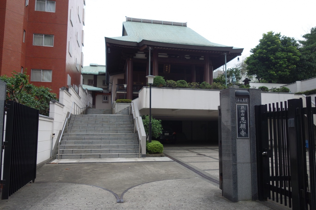 三田エリアを散策中こちらのお寺へ立ち寄りました。桜田通り沿いには幾つもの寺院が有って、この辺りは寺院通りと言った趣ですが、この忍願寺もその並びのひとつです。お堂が現代的で、1階が駐車場になっており階段を上がって本堂へアクセスするようになっていました。