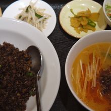 他に、小鉢(ハムカツとモヤシ炒め)、ザーサイ、サラダも提供された。