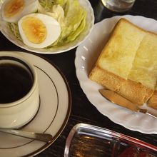 厚切りバタートーストに、サラダが付く。他に、ジャムも提供される。