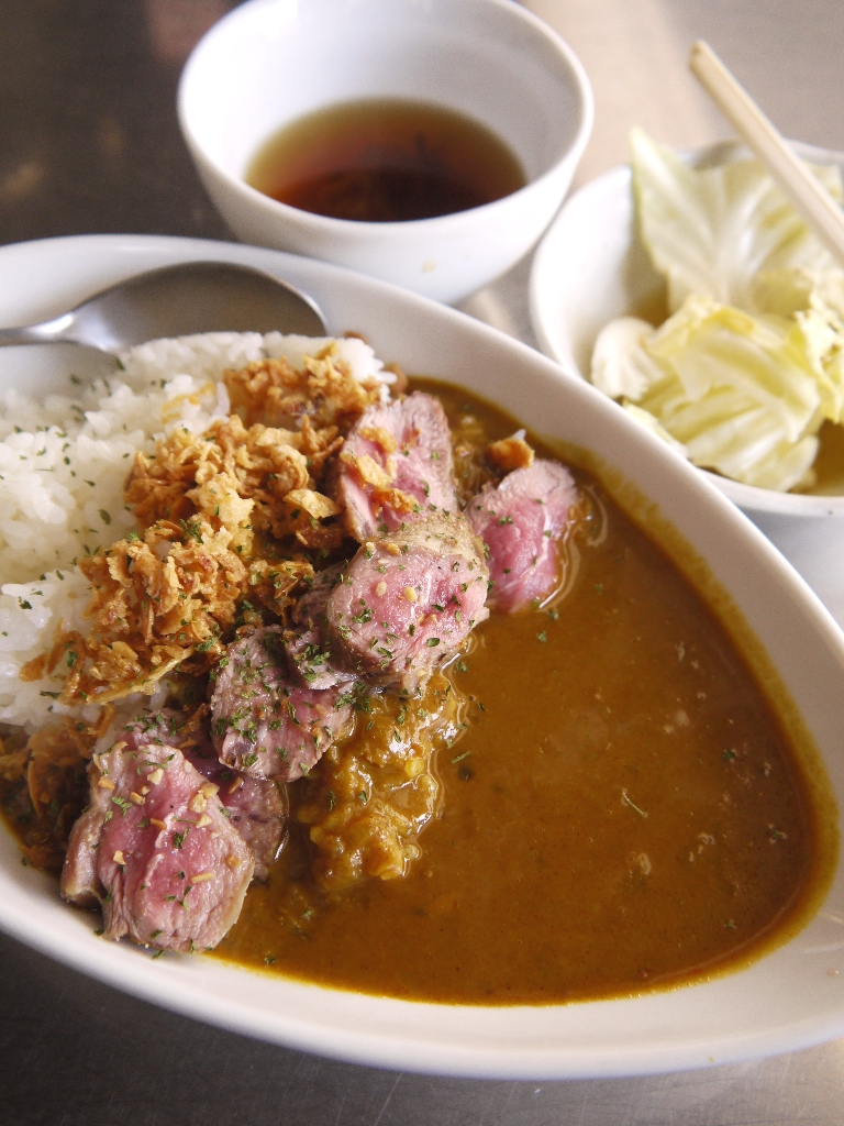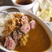 カレーのルーそのものにはラム肉は含んでいない様である。ラム肉はミディアムレアに焼かれていて、赤い部分が残っている。そんな事もあってか、柔らかい。ラム肉はくせがある、という考えが自分の中にはあったが、当店のラム肉はそうしたくせは無く、肉の旨味を堪能出来る。
