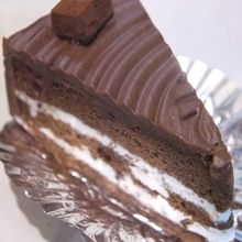 ココアケーキ生地と生クリームを交互に重ね、全体をチョコレートクリームで覆っている。