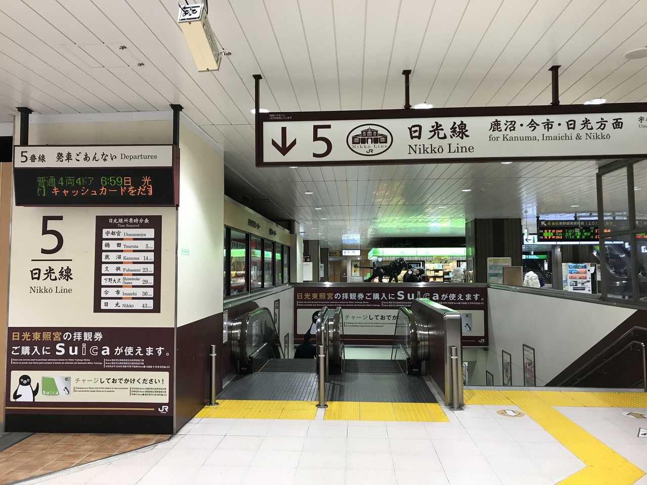 JR日光線は、宇都宮駅から日光駅までの区間。駅ホーム・車両は、日光東照宮への観光電車感のある施しがされた路線だった。