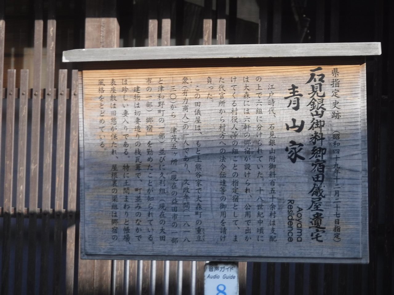 18世紀に石見銀山に設けられた6軒の郷宿の1つです。郷宿は公用で石見銀山や代官所などに訪れた村役人が宿泊や休息で利用した施設で、各地区の豪商がその任を負いました。青山家は大森地区の町並みの中で通りに面し妻入の建物は極めて珍しいので見所のひとつです