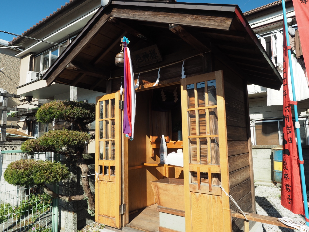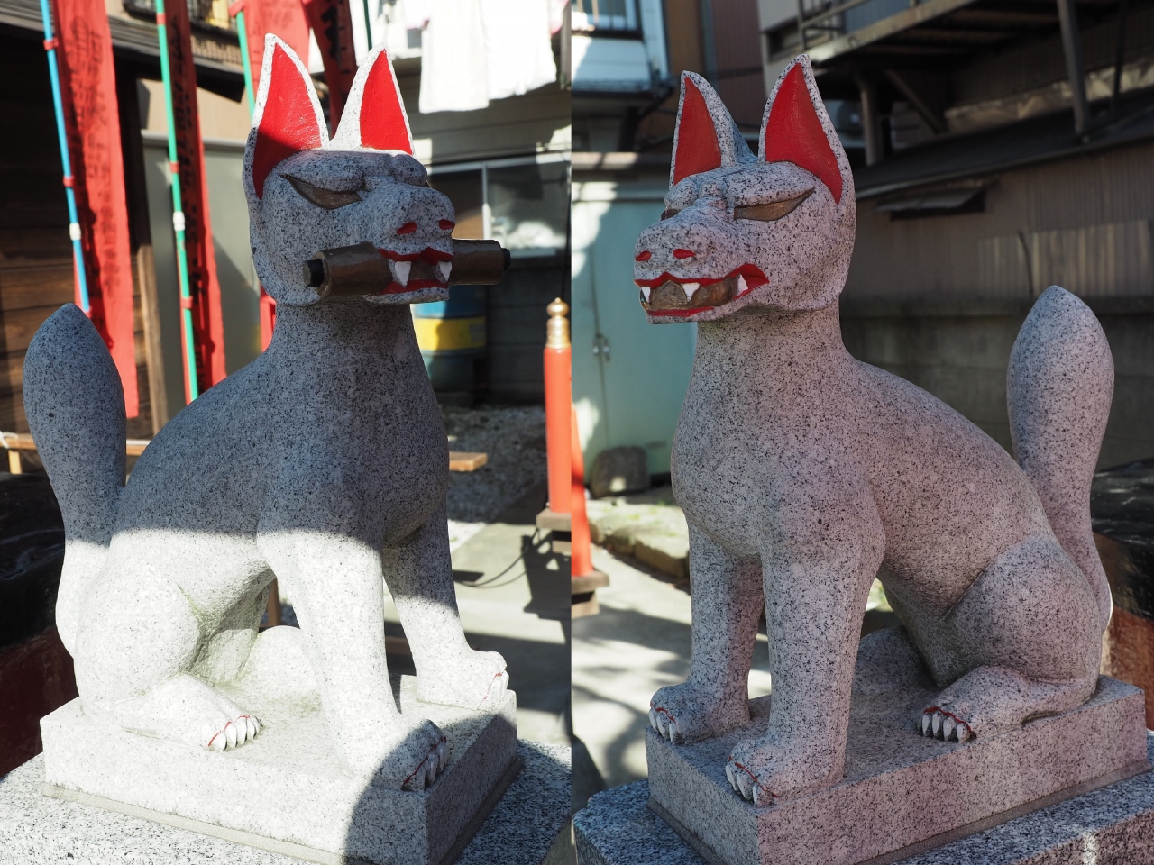 羽田七福いなりめぐりで訪問。その昔、漁師たちが祈願すると鴎が飛来し大漁であったと云うことから、鴎を大漁の兆しとして崇め、以後「鴎稲荷」と呼ばれるようになったそうです。御利益は開運招福。通りからは少し奥まった立地で分かり難いですが、いなりめぐりの時期は看板もあり迷いませんでした。住宅街の中にひっそりと佇み、普段は静かな神社だと思われますが、この日は大賑わいでした。朱塗りの鳥居は最近塗り直したのか新しいものでした。お稲荷様は特徴的で耳、鼻、口が朱色で目は金色。向かって左側は巻物、右側は宝珠を咥えており、少し妖気を感じました。