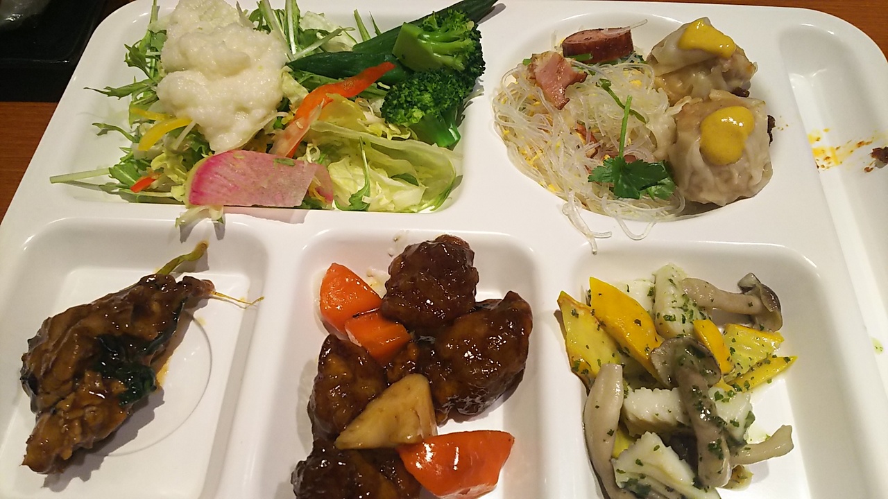 それ以外は凸凹のワンプレート皿にいろいろ取って来ますが、バイキングは食べ過ぎてしまいますよね┐('~`;)┌