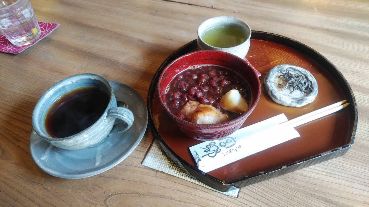 厳島神社と大聖院参拝後に龍髯松を見た帰りに町家通りにある古民家カフェに寄りました。商店街とは打って変わった静寂した通りでした。趣きのあるカフェで私はコーヒー妻はぜんざいを注文。コーヒーの豆はニシナ屋珈琲のオリジナルブレンドを使用し、1杯ずつ丁寧にハンドドリップで淹れているそうで、コクのある美味しいコーヒーでした。ぜんざいも美味しかったです。店内にはギャラリーもあり、色々なものが置かれていて見るだけでも楽しかったです。