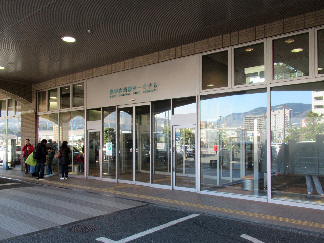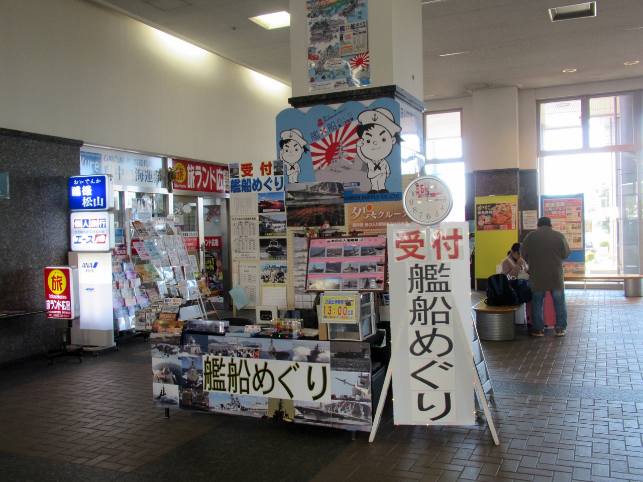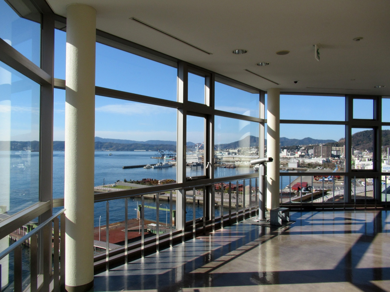 目的は「艦船めぐり」のチケット購入のためだったのですが、せっかくなので館内もめぐって見ました。1階には「艦船めぐり」の受付・発券所もありますが、桟橋ターミナルン本来の機能である松山・呉・江田島行きフェリーなどの案内・発券所や待合室がありました。2階には子連れのお客さん用にプレイロット(子どもの遊び場)もありましたが、広めの待合室であったはずの場所に長机が並べられ、高校生用の自習室になっていました。島から呉の高校に通っている生徒たちの便宜のためなのでしょうね。「艦船めぐり」終了後に3階のレストランを利用しましたが、そこからの景色も良いものでした。もちろん5階の展望台からの眺めは素晴らしいものでした。