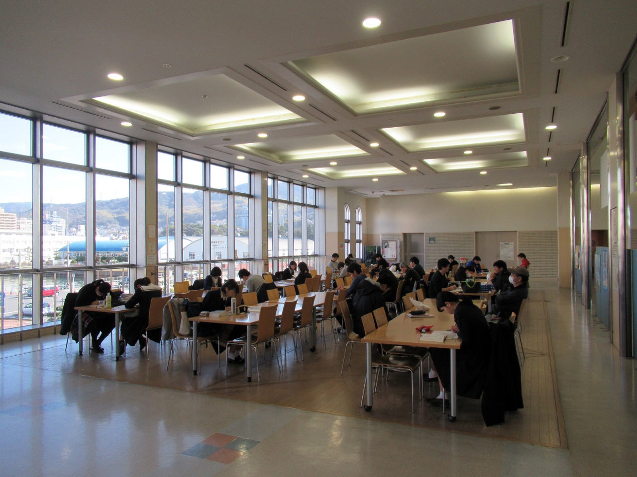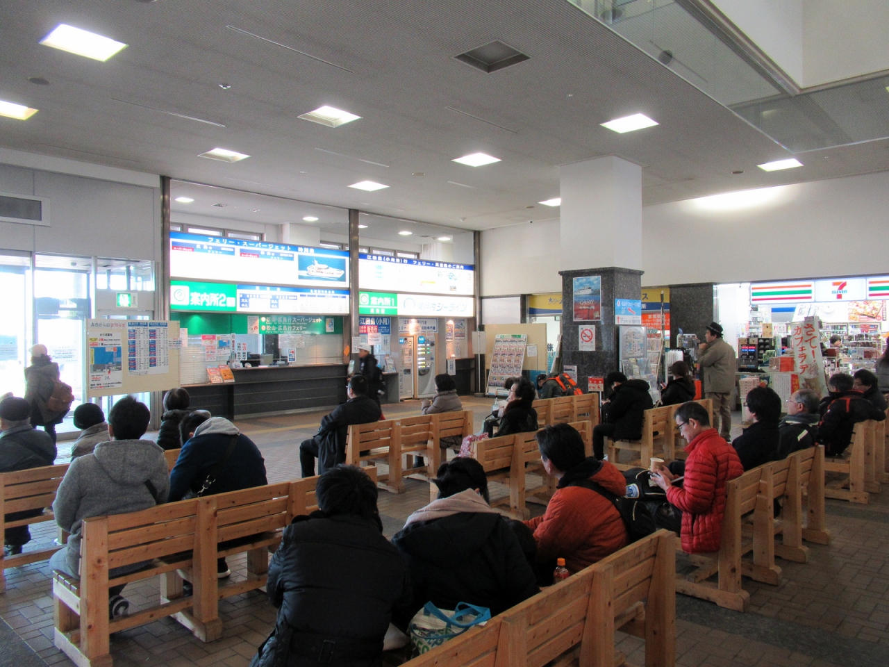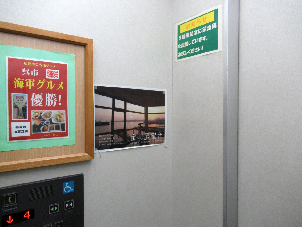 目的は「艦船めぐり」のチケット購入のためだったのですが、せっかくなので館内もめぐって見ました。1階には「艦船めぐり」の受付・発券所もありますが、桟橋ターミナルン本来の機能である松山・呉・江田島行きフェリーなどの案内・発券所や待合室がありました。2階には子連れのお客さん用にプレイロット(子どもの遊び場)もありましたが、広めの待合室であったはずの場所に長机が並べられ、高校生用の自習室になっていました。島から呉の高校に通っている生徒たちの便宜のためなのでしょうね。「艦船めぐり」終了後に3階のレストランを利用しましたが、そこからの景色も良いものでした。もちろん5階の展望台からの眺めは素晴らしいものでした。