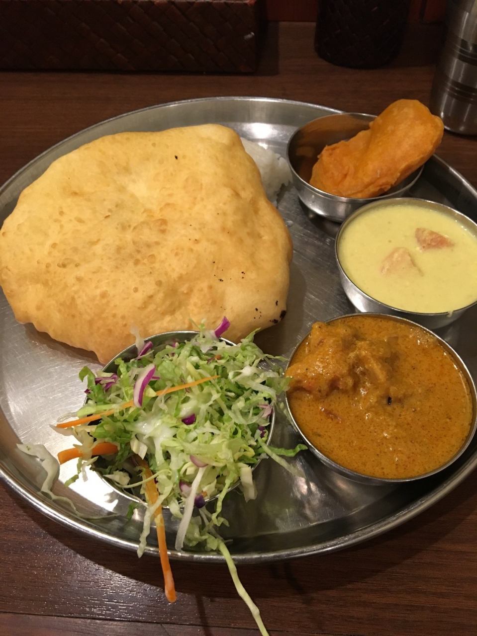 ランチメニューのAセットを注文。カレー2種と本日のお惣菜にしました。お惣菜はジャガイモのインド風天ぷら。カレーは3種類の中から、チキンカレーと野菜カレーにしました。もう1種類はマトンのキーマカレーでした。ライスと一緒に出てきた、バトゥラという揚げパンみたいなのが、フワフワで超絶に美味しかったです!