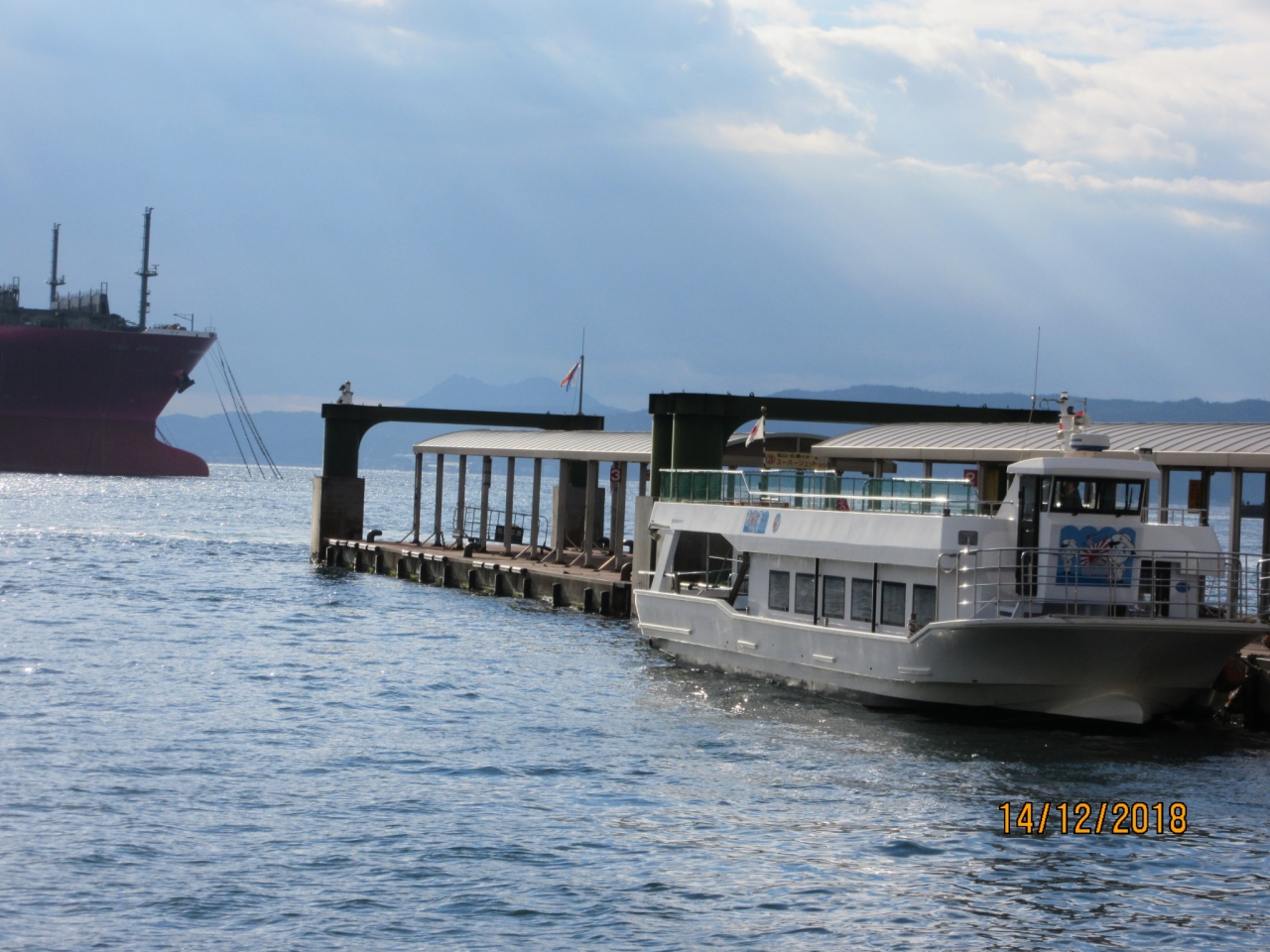 ゆったりとしたスペースで2階の休憩所には椅子とテーブルがあり囲碁を楽しんでいる人たちもいた。ターミナルからは港に停泊中の艦船の数々、江田島方向と造船所の景色を楽しめた。