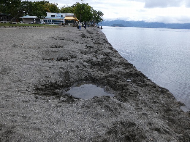 屈斜路湖に向かった観光バスが停車したのは湖畔にある「砂湯」でした。温泉でもあるのかなと思って着いたのが単なるビーチとお土産物店。何だろとビーチに近づくと、中国人観光客がビーチの砂を掘って遊んでいました。しみ出した水に手を入れると、暖かい。こちらは砂を10センチほど掘ると、温泉が湧き出すという場所でした。夏場だと、キャンパーたちが自分たちで温泉を掘り、温まる光景がみられるというのですが、ほとんど晩秋になった9月下旬の北海道、さすがにぽちゃんと入る人は見かけませんでした。足湯にしてもちょっと寒いし。夏場なら、かなり面白そうです。。