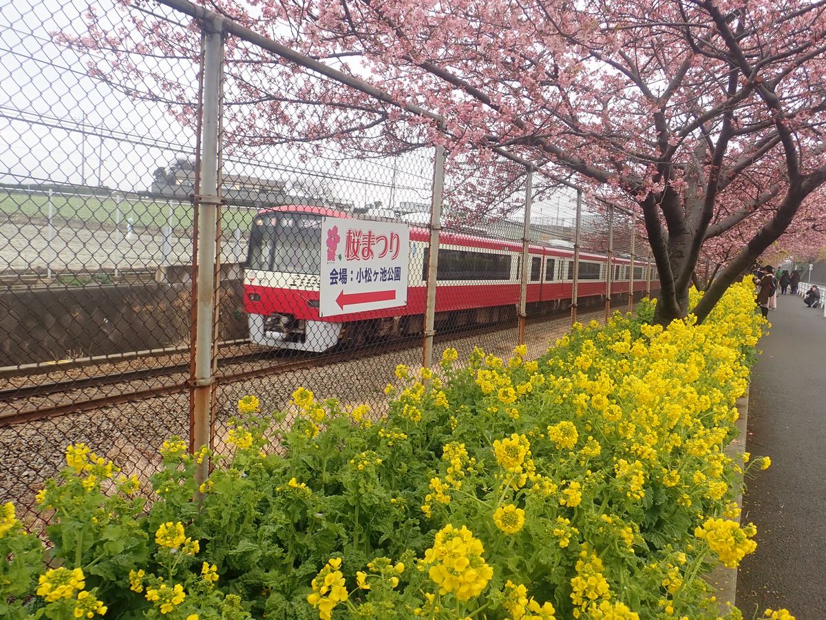 三浦海岸の線路沿いに桜と菜の花と、赤い京急電車の3ショット