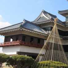 松本城天守閣でも、異才を放つのがこの江戸時代に増築された月見櫓でしょう。大天守見学を終えて一階に降りて順路にそって進むと、この月見櫓に至ります。赤い欄干を3方向にめぐらしていて、とても開放的な造りになっていました。座布団を敷いて月見をする、雅な江戸時代の情景を思い浮かべることが出来ました。