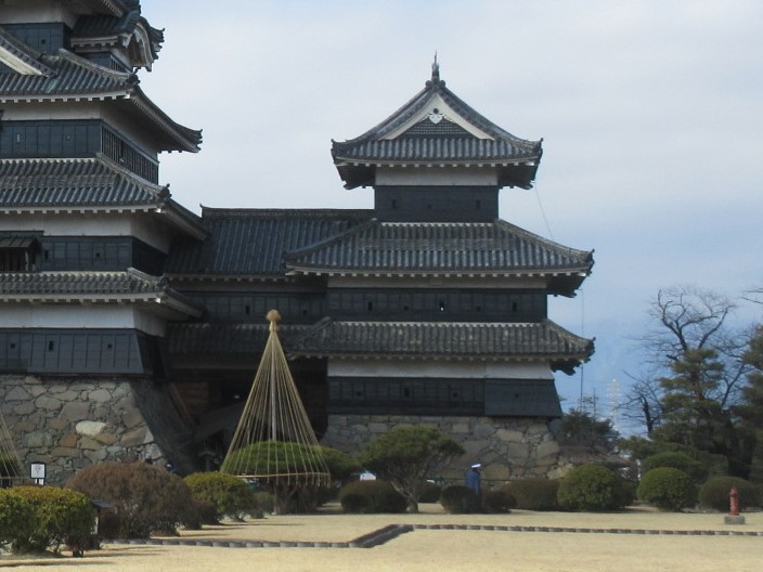 松本城の天守閣入り口に向かって右手に見える、大天守と渡櫓で連結された建物が乾小天守です。丸太柱が使われていることが特徴の一つですが、私が訪問した際には耐震強度の関係で見学が制限されていました。そのため外側からの見学しかできませんが、お寺にあるような「花頭窓」が彦根城と同様に取り入れられていて、非常に興味深かったです。
