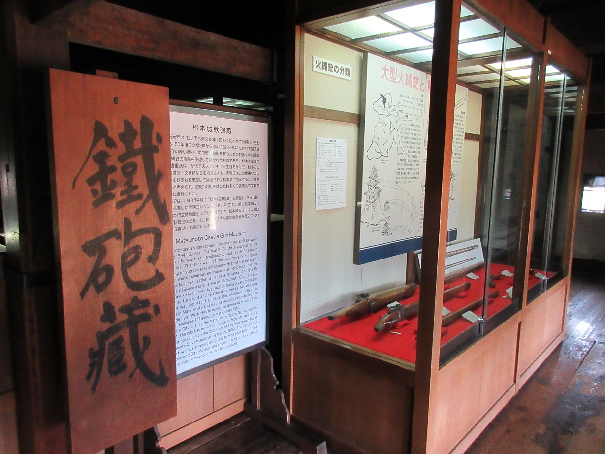 松本城大天守の2階に、松本市出身の方から寄贈されたという火縄銃など多数展示された「鉄砲蔵」がありました。火縄銃も時代ごとに大きさが異なり、中には今のバズーカ砲を彷彿とさせるようなサイズの物もありました。また、様々な解説図もあって、それらの兵器の使われ方なども分かって興味深かったです。