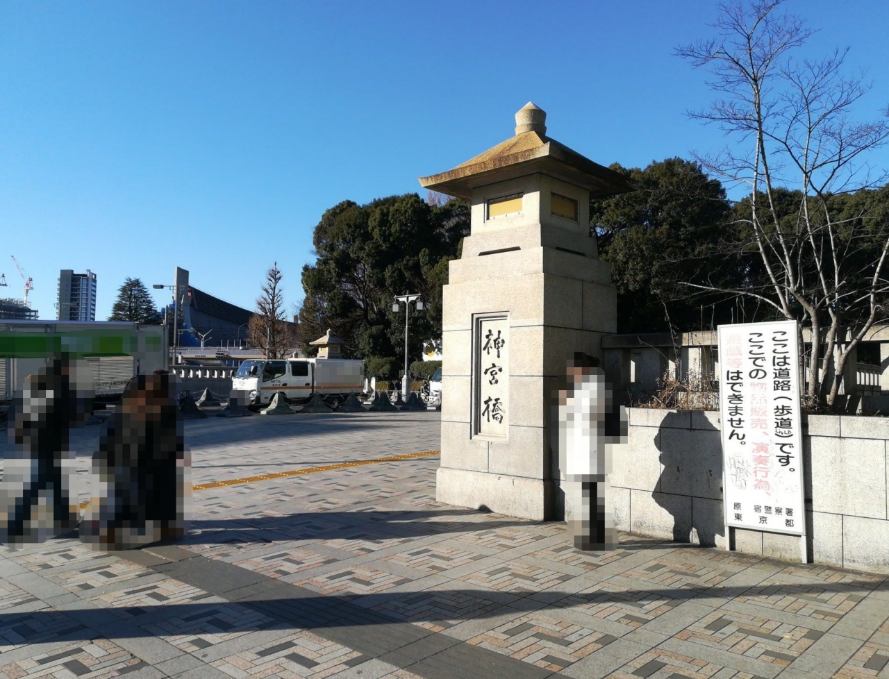 山手線の原宿駅を出て南(品川側)に隣接している橋です。駅近くに橋が二つありますが、明治神宮に向かう際にはこちら、代々木公園に行くには五輪橋をわたることになります。車も通れる広い石造りの橋で参拝者が多くても大丈夫ですね。