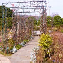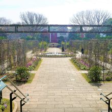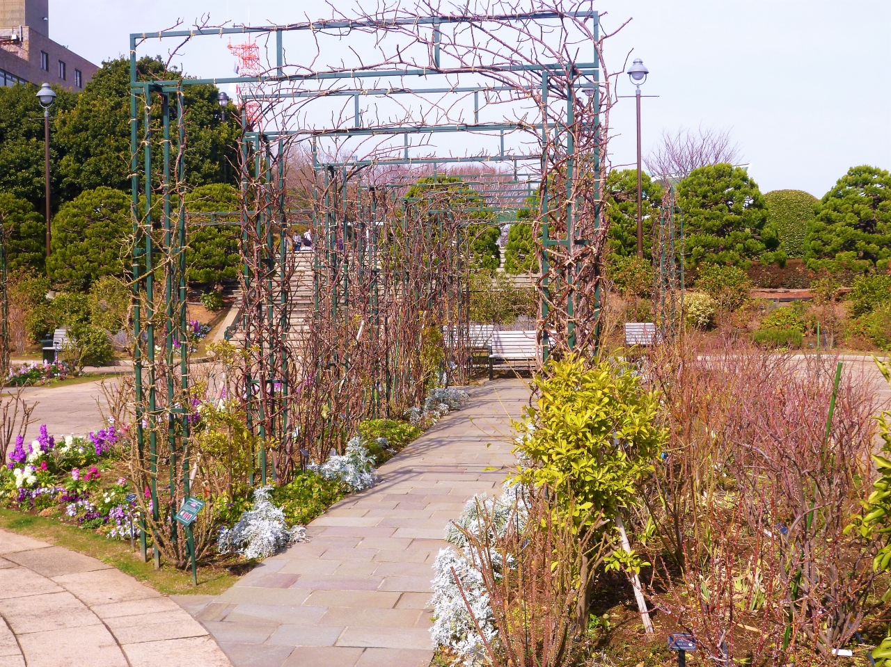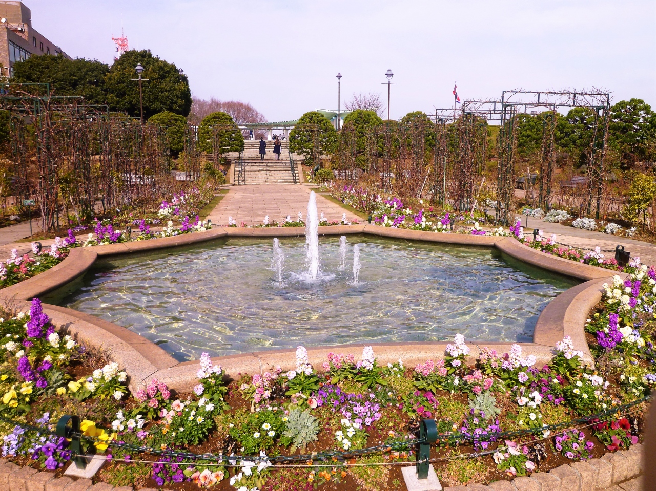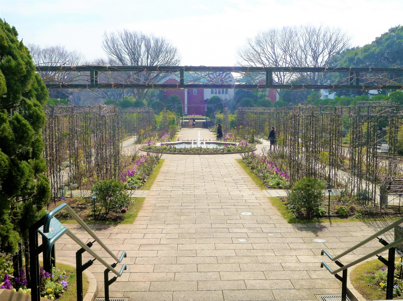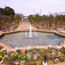 `港の見える丘公園`の展望台から少し低めに[沈床花壇]があります。(沈床;ちんしょう;造成した工夫をそのまま用いて名称に/`花壇`なら咲いてる時の花の名前が良いと思うのですが;バラ園等) 2月でしたが多様な花々が咲いている八角プールに噴水が♪ のんびりした気持ちに(^^) 季節がチョッと早いので`バラを飾ったトンネル`が見えなかったのは残念!