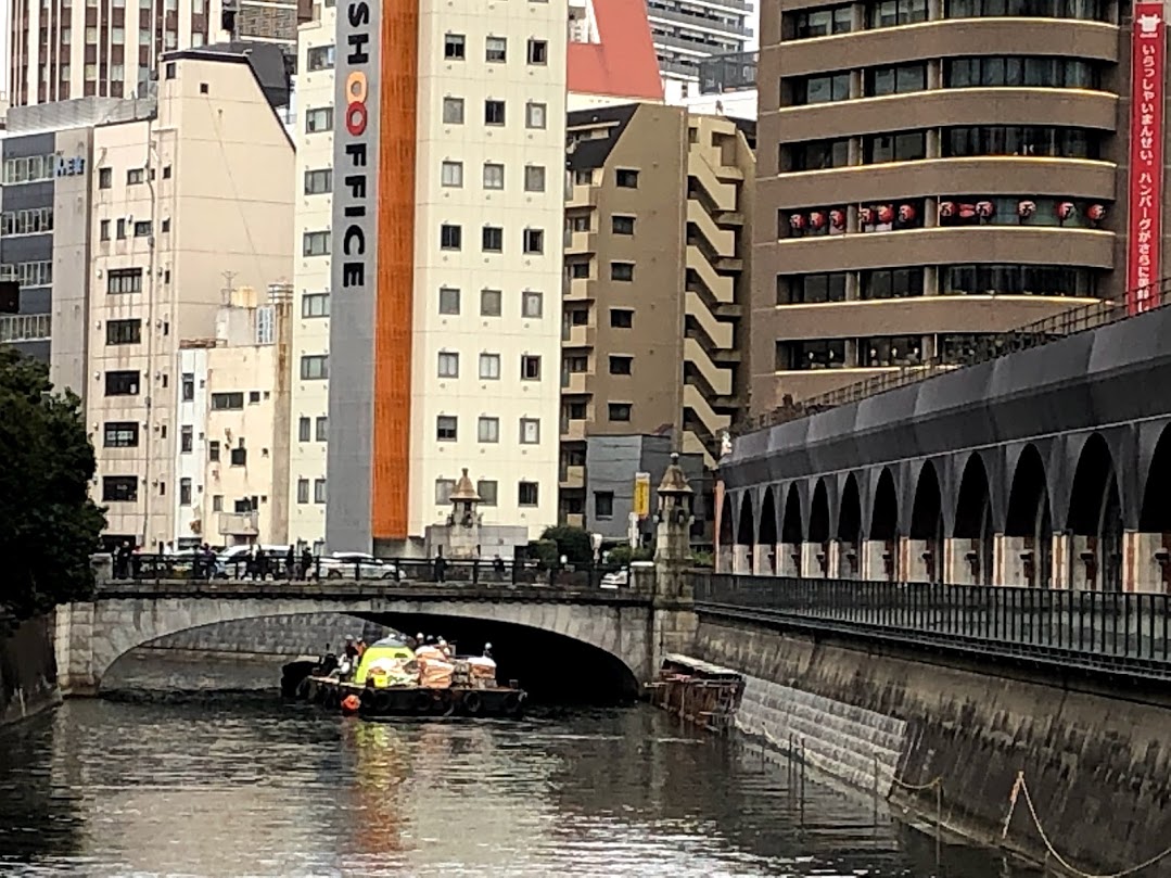 昌平橋から万世橋を眺めると、ちょうど貨物船が橋をくぐるところで、印象的な光景でした。