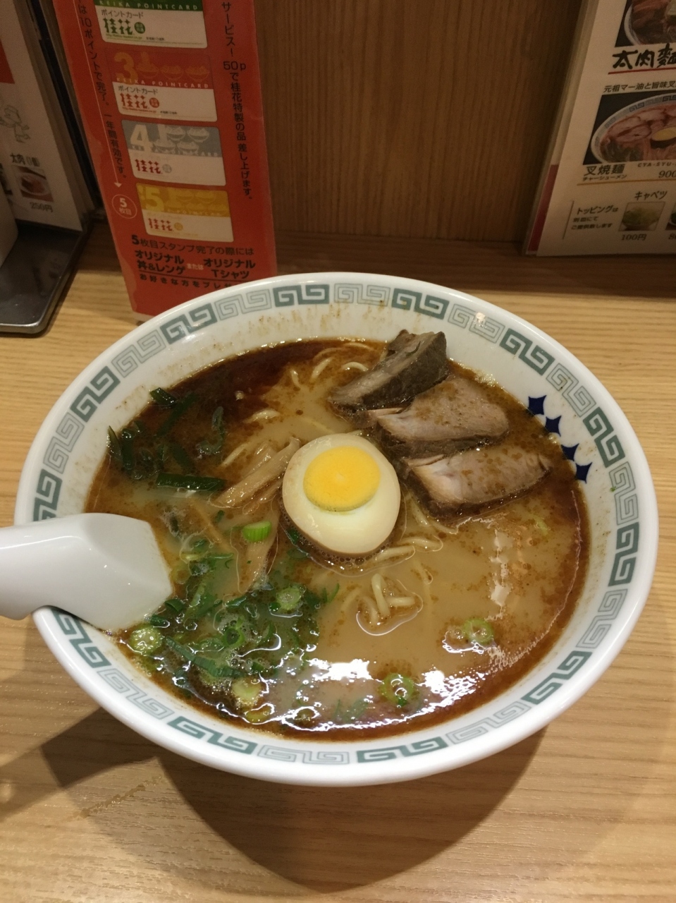 熊本ラーメンと言えば桂花ラーメン。一時期の勢いはないにしても、たまに、無性に食べたくなる一杯です。若干の豚骨臭さは感じますが、意外とあっさりしていて美味しかった。昼時のランチは混み合ってますが飲んだ後の〆の深夜は空いていました。