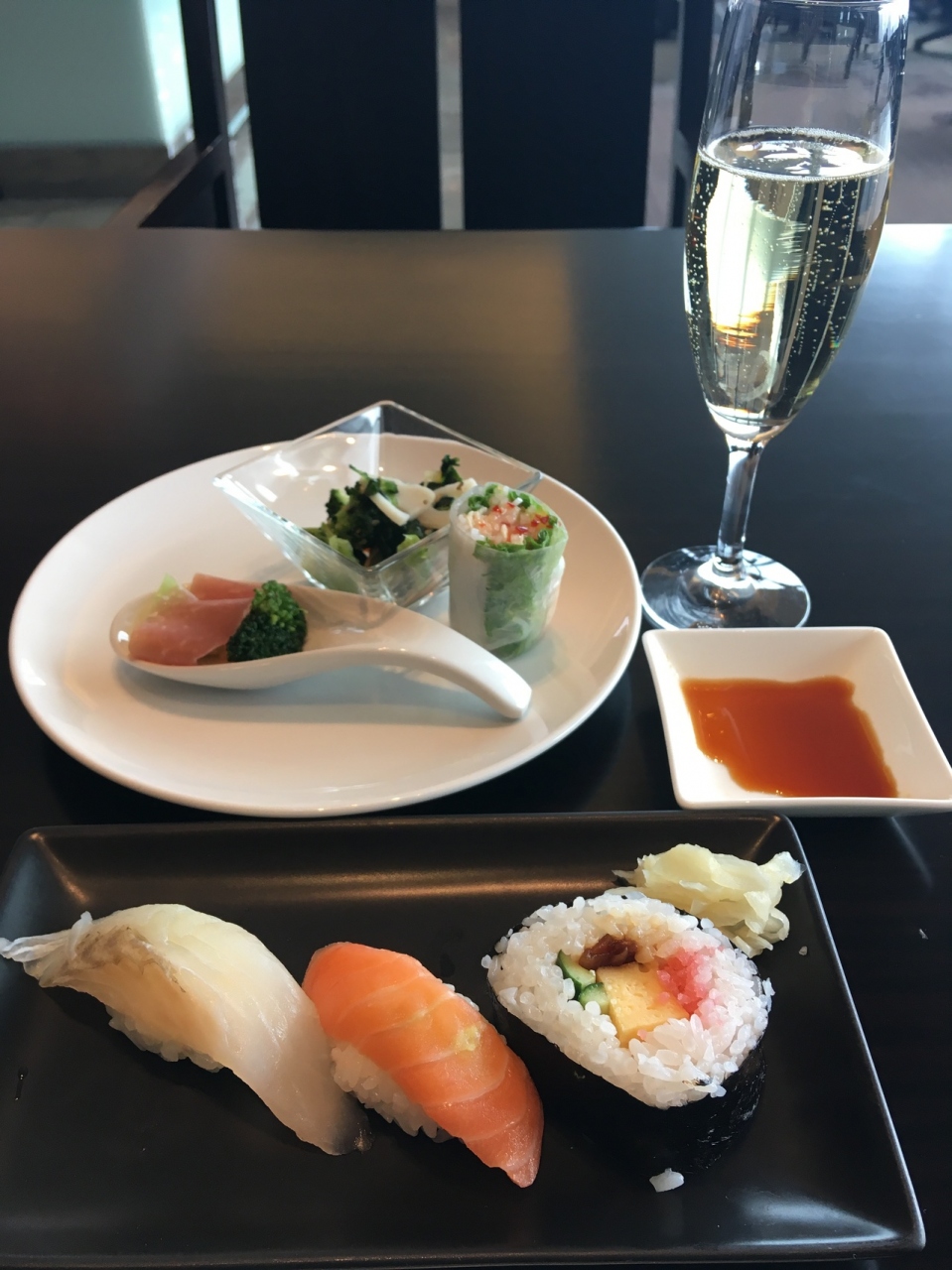 名物の寿司バーで天然ひらめ、サーモン、太巻を握ってもらい、小さくおしゃれに盛られた前菜類とお酒でゆっくりとした一時を過ごせました。