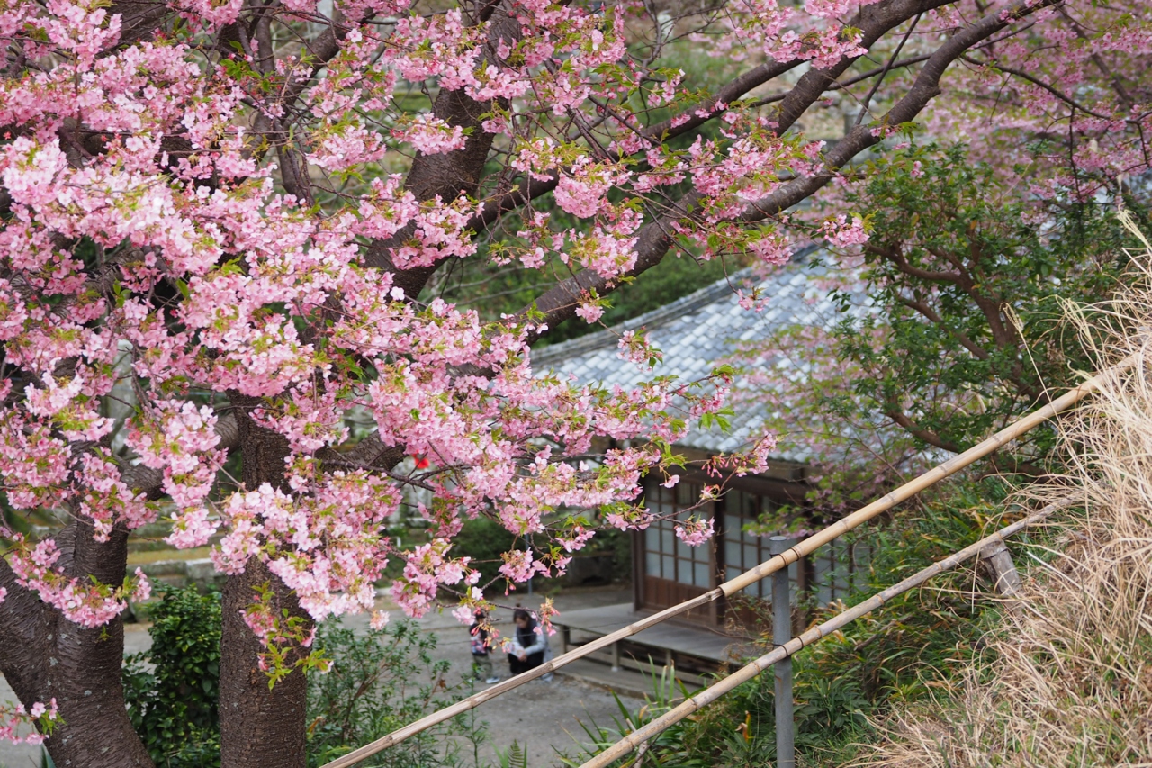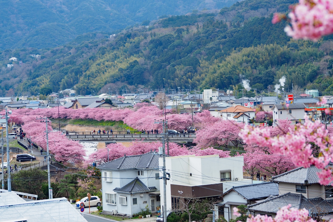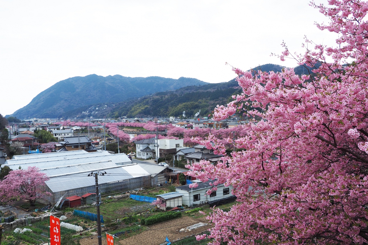 お堂から少し登ったところに桜の見晴台があり河津桜並木を上から見渡すことができる。