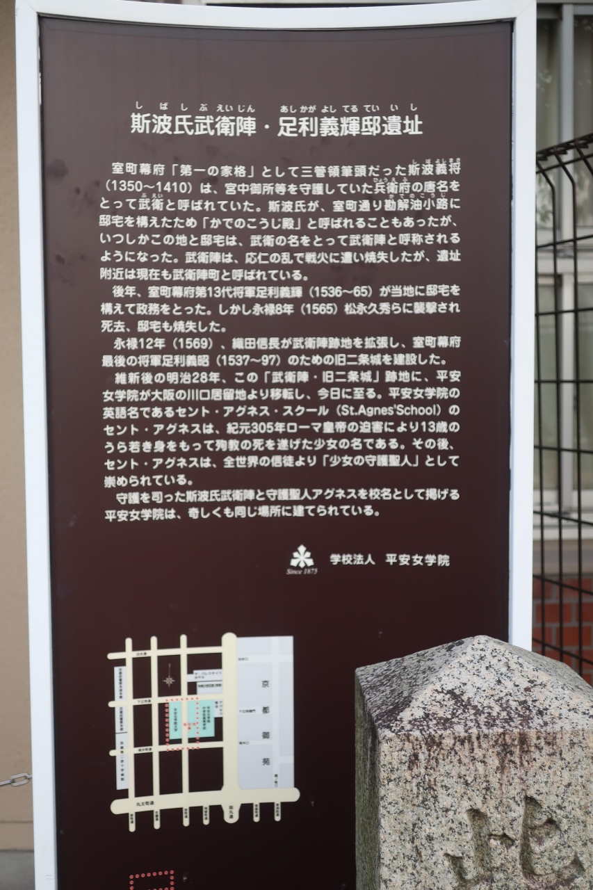 京都御所の西側、平安女学院の室町通りに面した入口の右脇に斯波氏武衛陣・足利義輝邸遺址があります。室町幕府の三菅領筆頭だった斯波義将の邸宅が応仁の乱時の焼失したあと、室町幕府第13代将軍 足利義輝が邸宅を構えた場所が平安女学院になっています。石碑のみですが、御所の近くは歴史上の重要史跡が多く面白いです。