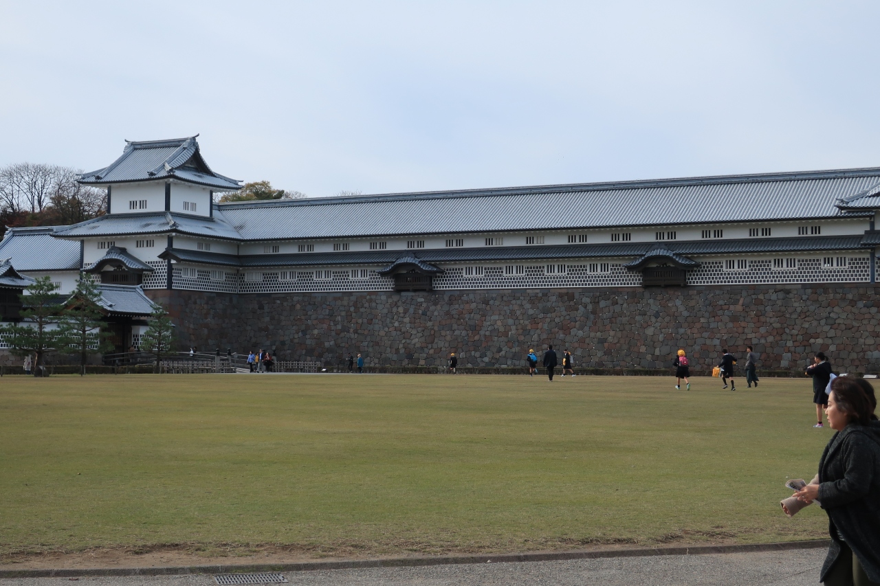 この日は石川門から三の丸広場に入った。広々としたスペースが広がるが、幕藩時代から広場のあったところで城郭の再建が進んでいないわけではないという。正面に河北門、五十間長屋、橋爪門と並び、景観的にも巨大な木造建築物が並ぶさまは見応えを感じる。