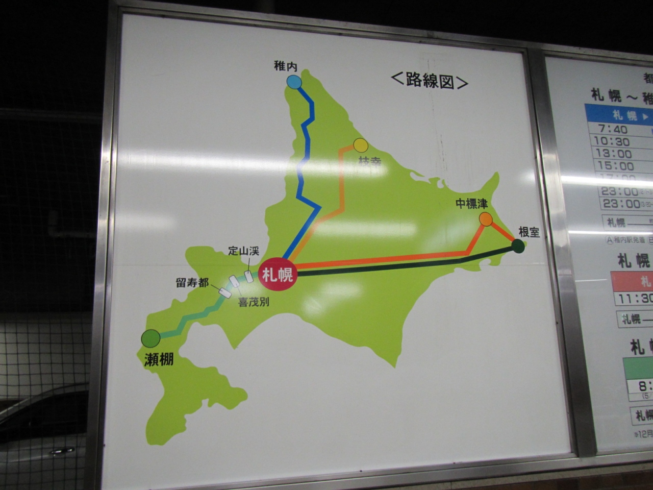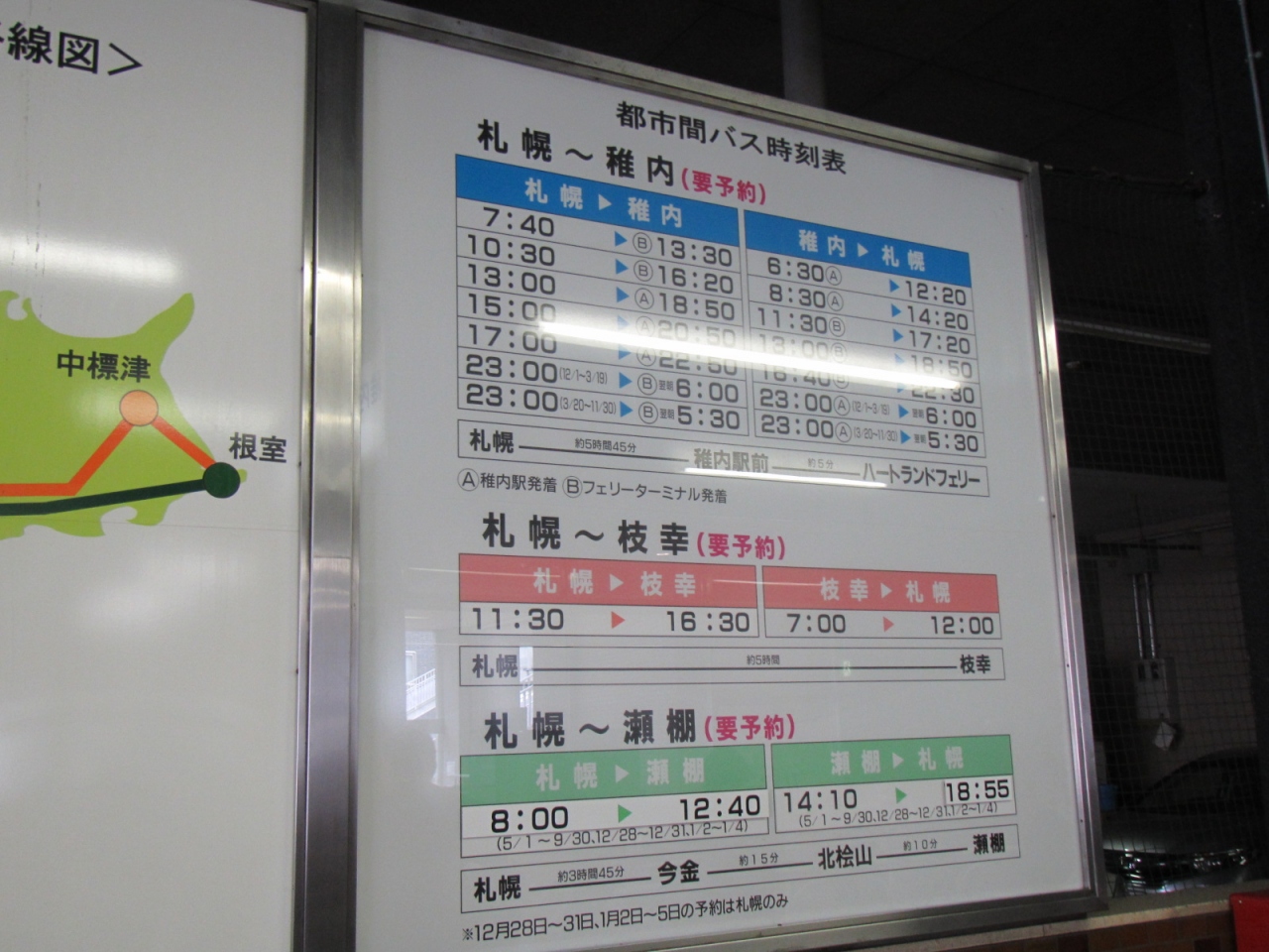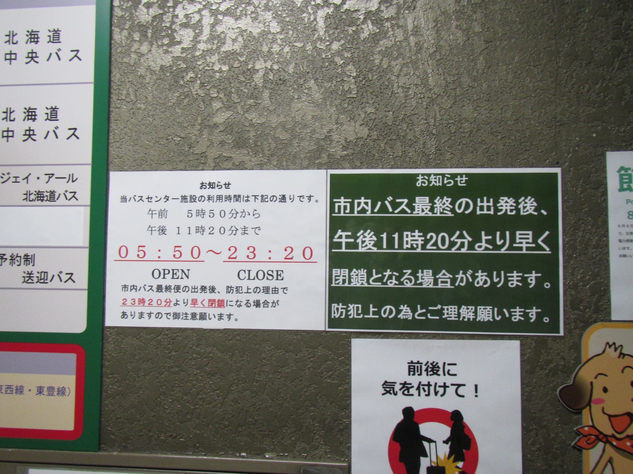 また、バスセンターの北側の道路上に、函館又は釧路行きの“北海道バス”が発着するので、建物内の乗り場と勘違いしないよう注意が必要です。 バスセンター横に横づけするだけで、センターの建物を使わない分、料金がちょっぴり割安となっています。