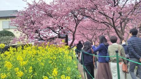 河津町名物河津桜まつり。例年2月から3月上旬にやっています。川沿いに数百本の桜が満開で、ピンク色が濃く非常にきれいです。また、場所によっては菜の花も植えてあり、菜の花の緑色・黄色と桜のピンク色のコントラストがとてもきれいで写真映えします。クルマはごったがえしているので電車がいいかも。