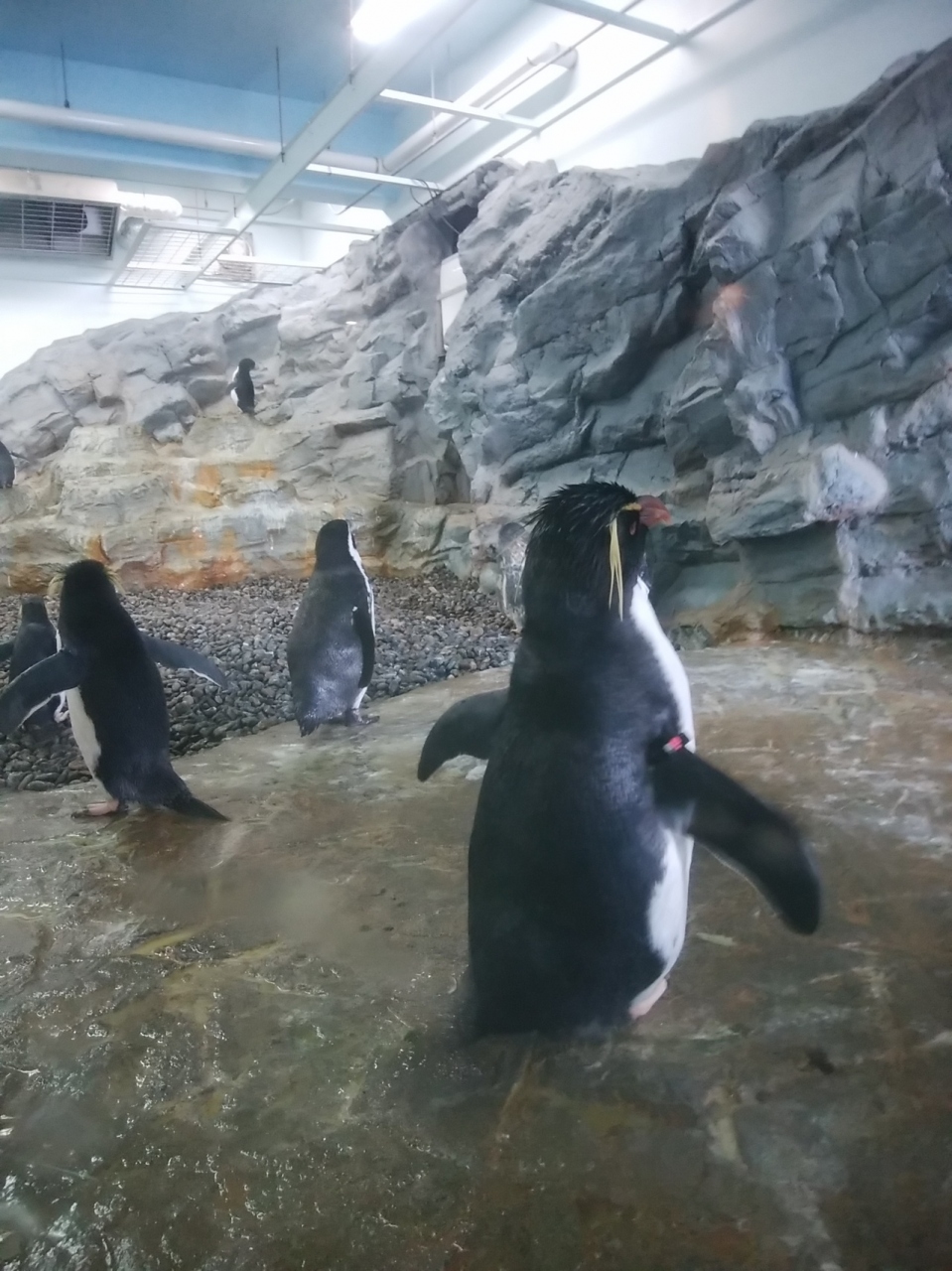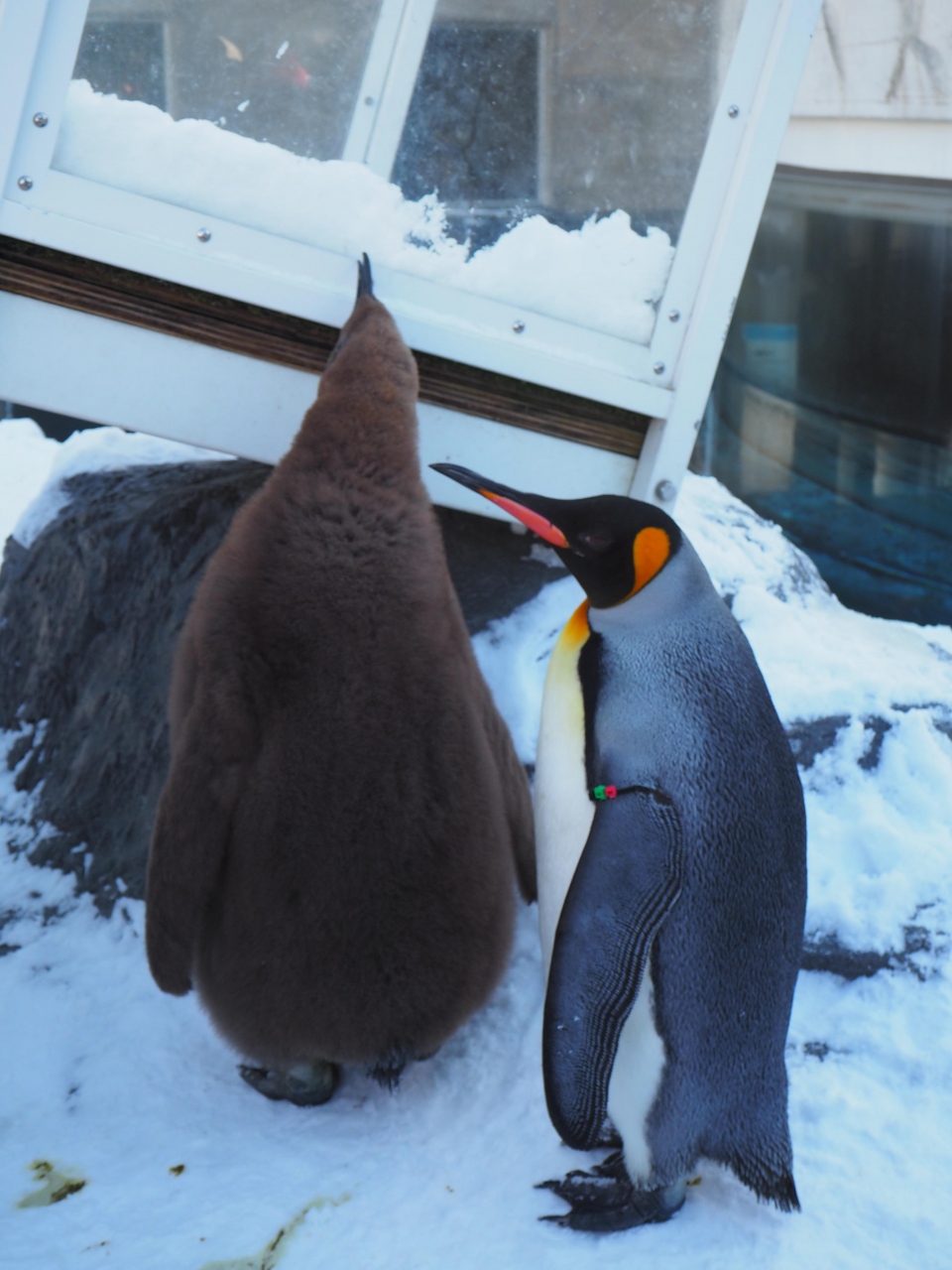 水槽を眺めながらそとに出ると、飼育員がペンギンに餌やりをしてました。ちょうどキングペンギンがいて、赤ちゃんも見ることができました。